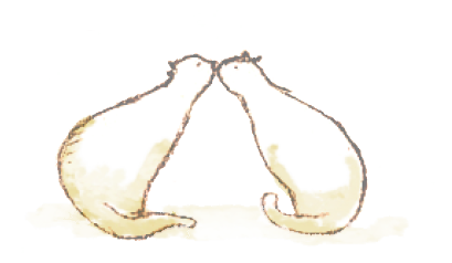 鼻先を寄せ合う、二匹の白猫。左右対称の構図と、温かみのあるセピアの描線で表現された手描き風のタッチ。動物同士の穏やかな交流や、仲睦まじい関係性を描いた一場面。