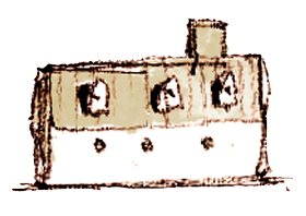 横に長く連なる窓が特徴的な、二階建ての建物。クレヨンでラフに描いたような、ざらつきのある線と素朴な色使いのイラスト。どこか懐かしさを感じる風景。