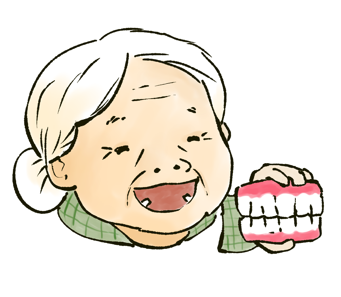 白髪を後ろで束ねたおばあちゃんが、緑のチェック柄のシャツを着て入れ歯を右手に持ち、笑顔で見せる姿。手にした入れ歯はピンク色の歯茎部分と白い歯列が描かれている。背景や小物はなく、人物と入れ歯の動作を強調した構図。敬老の日をテーマに、高齢者の暮らしやユーモラスな一面を表す場面。