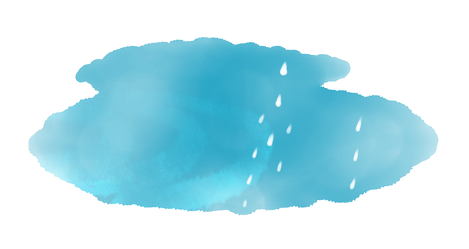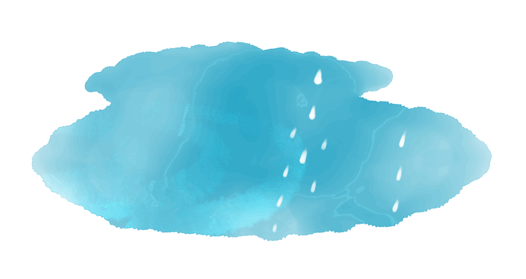 淡い水色と白で表現された、広がる水たまり。白い水滴が右上から左下へ斜めに流れ落ちる様子。水彩のにじみと柔らかい筆致が特徴で、水の透明感が広がるシンプルな構図。天気予報のアイコン。