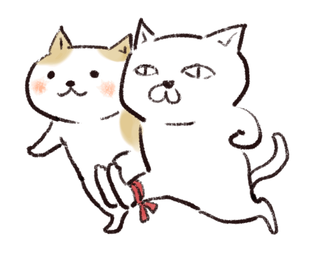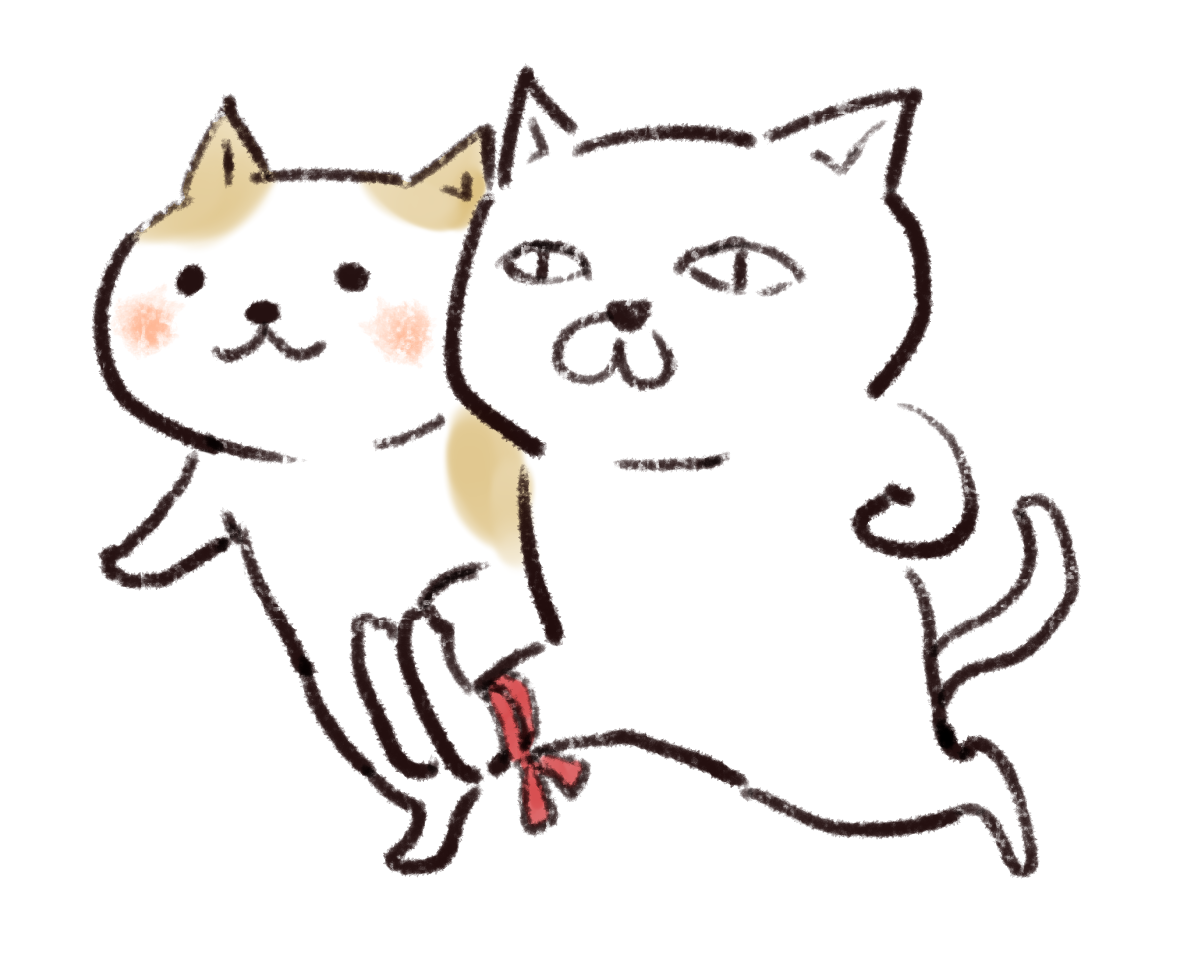 二人三脚で走る2匹の猫。一匹は笑顔、もう一匹は真剣な表情を浮かべる対照的な描写。足元が赤いリボンで結ばれた、協力して前進するポーズ。水彩とクレヨンを併用したような、柔らかい筆致と温かみのある主線。運動会や秋のイベントをテーマにした、競技中の動物の描写。