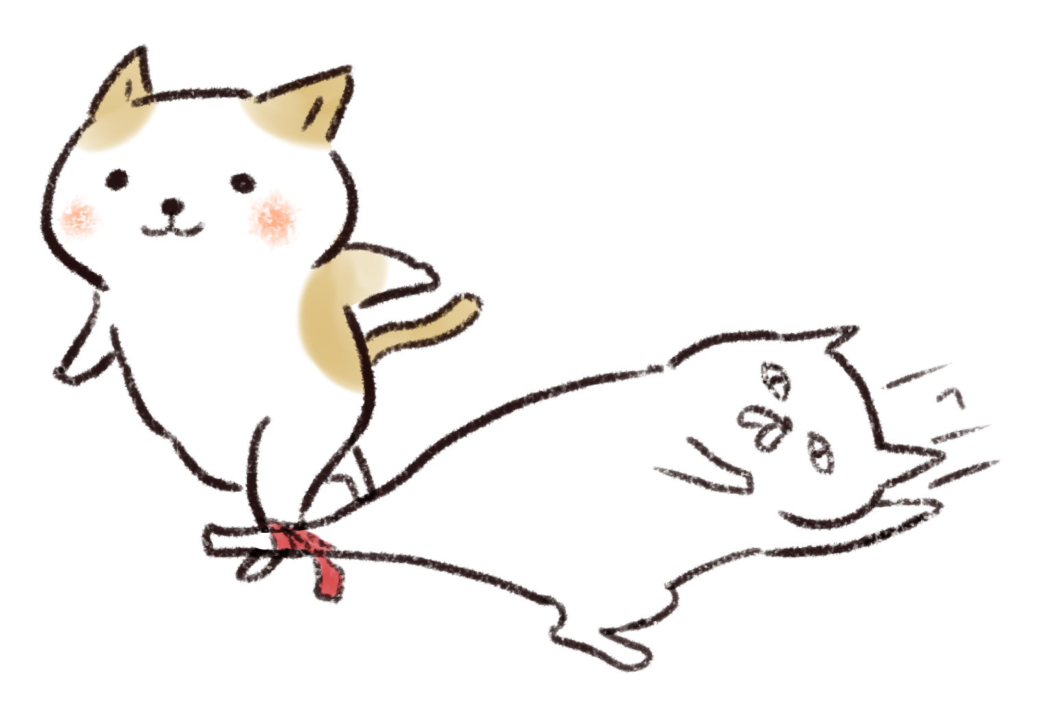 二人三脚で走る途中で、一匹が転倒し引きずられる猫。元気よく走る猫と、仰向けに倒れ困惑する表情の猫の対比。赤いリボンで足が結ばれた、動きのある一瞬を捉えた構図。水彩とクレヨンを併用したような、柔らかい筆致と温かみのある主線。運動会や秋のイベントをテーマにした、競技中の動物の描写。