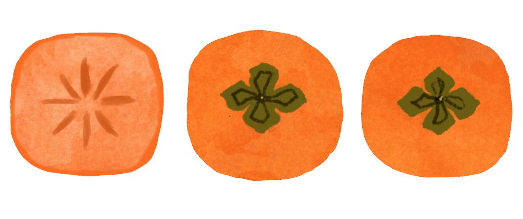 横一列に並んだ柿の断面とヘタを描いたモチーフ。水彩のにじみとムラによる手描きの質感、鮮やかなオレンジ色が特徴。左端は縦切りの断面、中央と右はヘタ付きの丸ごとの柿。秋の味覚と季節感を表現、和風や食品関連のデザイン素材。
