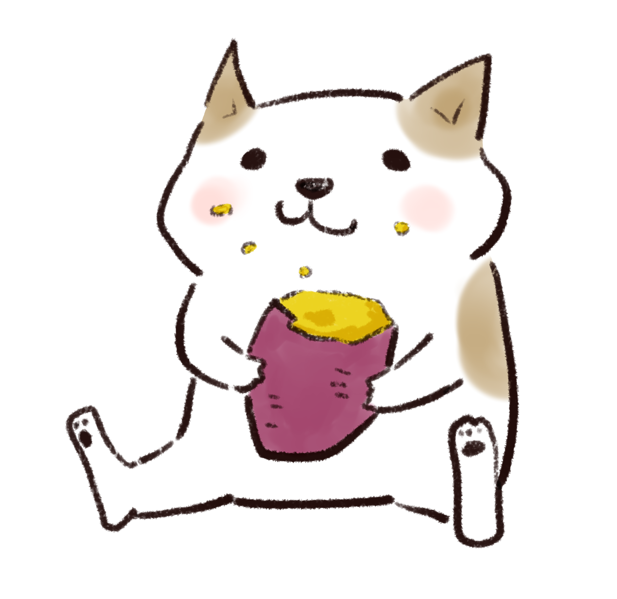 座っている白色の猫が、焼き芋を両手で持って食べている様子。口元や頬には黄色い芋のカス、満足そうな表情。太めの主線と筆のかすれ、手描きの温かみある質感。さつまいもの皮は紫、中身は黄色で秋の味覚を表現。秋の話題に適した挿絵。