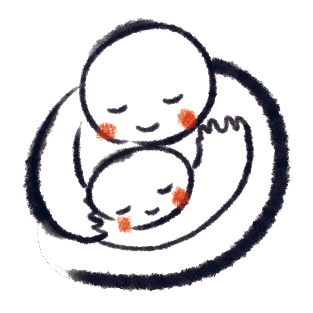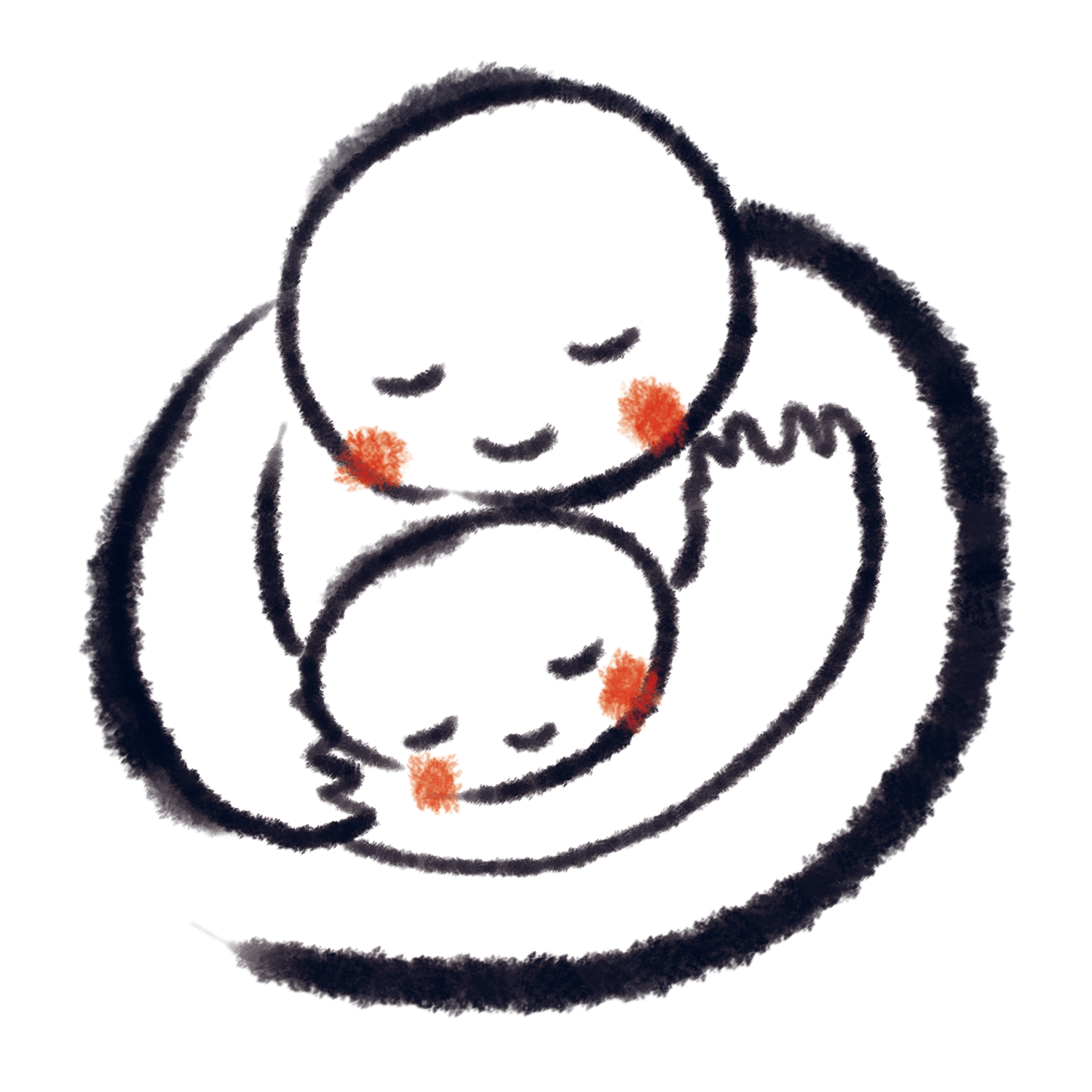 二人の人物が抱き合う様子を丸い形で表現した線画モチーフ。太い黒の主線と筆のかすれ、温かみのある手描きの質感。二人とも目を閉じ、頬にオレンジ色のチークを彩色。愛情や安心感、親密な関係性を示唆する構図。育児、家族、絆などをテーマ。